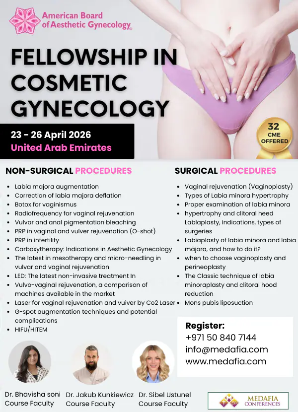 A fully packed 4-day Fellowship in Cosmetic Gynecology one-on-one surgical and non-surgical training course program in UAE. Learn Aesthetic Gynecology procedures certified by the American Board of Aesthetic Gynecology. This Fellowship course has a full hands-on lecture by International Faculties.